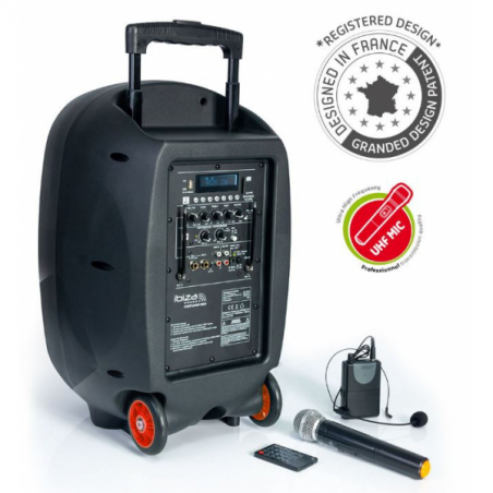 Sono portable 350W sur batterie Ibiza Sound PORT12UHF-MKII-TWS Bluetooth équipée de deux micros sans fil UHF: 1x micro sans fil main et 1x micro sans fil serre tête La PORT12UHFMKIITWS intègre un haut parleur de 30 cm de diamètre, un lecteur multimédia USB MP3 et un trolley à roulettes permettant de se déplacer aisément