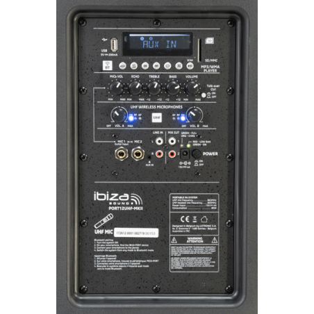 Sono portable 400W Ibiza Sound PORT15UHF-MKII Bluetooth sur batterie équipée de deux micros sans fil UHF: 1x micro sans fil main et 1x micro sans fil serre tête La PORT15UHFMKII intègre un haut parleur de 38 cm de diamètre, un lecteur multimédia USB MP3 et un trolley à roulettes permettant de se déplacer aisément.