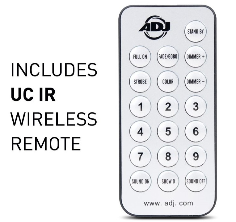 En plus du contrôle DMX filaire, il est fourni avec une télécommande UC-IR pour des ajustements rapides sans fil. Cela permet aux utilisateurs d’activer les différents modes et d’ajuster la luminosité sans avoir à manipuler directement l’appareil.