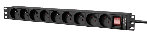 Le Caymon PSR109FSB est une multiprise secteur conforme aux normes ANSI/EIA RS-310D, DIN41491 et IEC60297, offre une distribution d'énergie fiable avec 9 prises françaises, un interrupteur lumineux, un câble de 2,5 mètres et un boîtier en aluminium noir, idéal pour les racks 19 pouces.