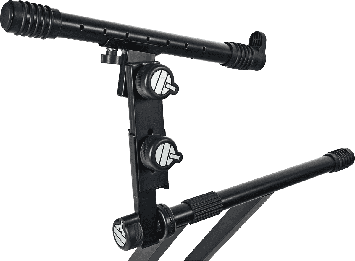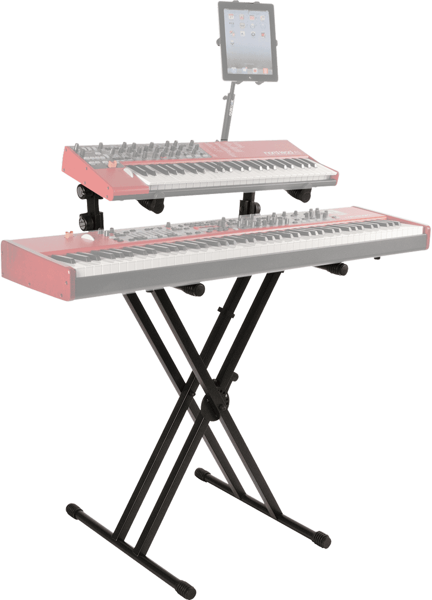 Le second niveau, orientable jusqu’à 90°, permet une inclinaison précise pour un accès confortable à un clavier secondaire, un synthétiseur ou un contrôleur MIDI. Le cadre en acier 30 x 30 mm offre une durabilité accrue face à un usage intensif, que ce soit en répétition ou en tournée.