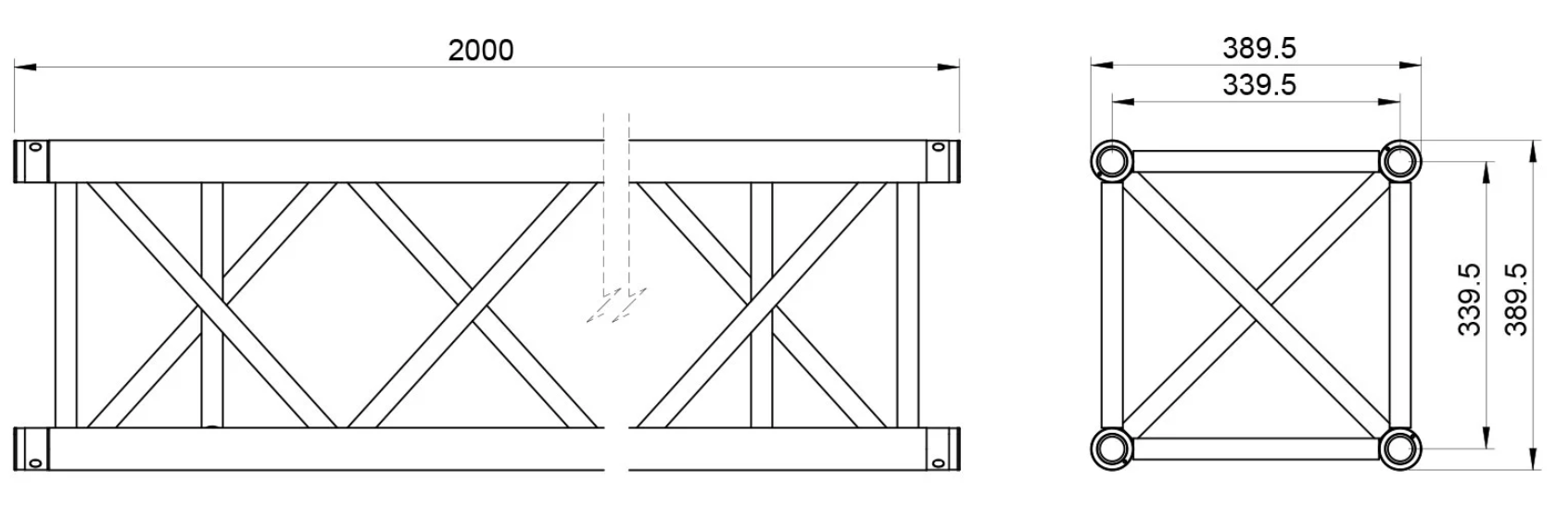 Les tubes principaux de 48,3 mm de diamètre avec 3 mm d’épaisseur participent à la rigidité de l’ensemble, tandis que les barres de renfort de 25 x 2 mm complètent la conception spatiale de la gamme QUATRO39. La section présente 340 mm d’entraxe entre les tubes pour 390 mm à l’extérieur, ce qui définit l’encombrement utile et la logique d’assemblage de cette structure aluminium carrée. Sur le terrain, cette géométrie facilite la constitution de portiques, supports techniques, cadres ou toits de scène, avec une lecture claire des contraintes de montage et de charge.