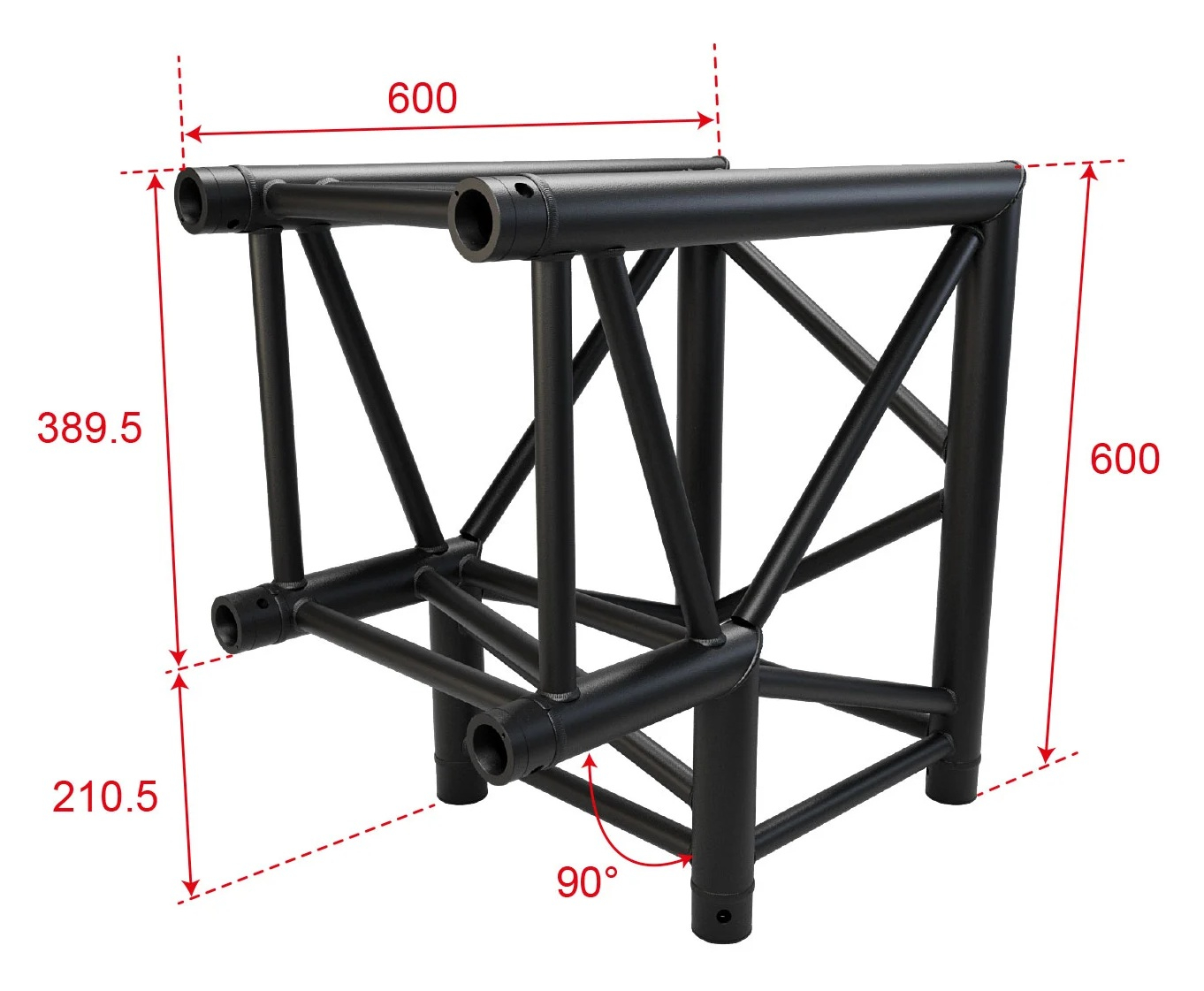 Pour un technicien de structure, un installateur ou un prestataire événementiel, ce type d’angle répond à un besoin concret de changement de direction dans un montage horizontal ou vertical. La mention charge lourde oriente le produit vers des configurations exigeant une pièce adaptée à ce niveau d’usage, dans le cadre strict des données fournies. Le format d’encombrement maximal de 60 cm x 60 cm aide aussi à anticiper sa place dans la préparation de chantier. Au regard de ces éléments, le QUATRO39-A01 convient particulièrement aux utilisateurs qui recherchent une jonction 90° carrée clairement dimensionnée et directement exploitable.