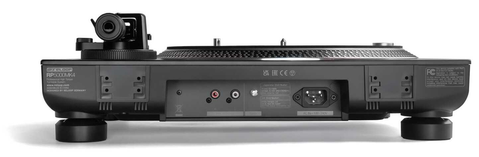 La Reloop RP-5000 MK4 dispose d’une sortie phono plaquée or et d’une borne de masse, assurant une transmission du signal propre vers une table de mixage DJ. Le panneau de connexions encastré facilite une installation affleurante.