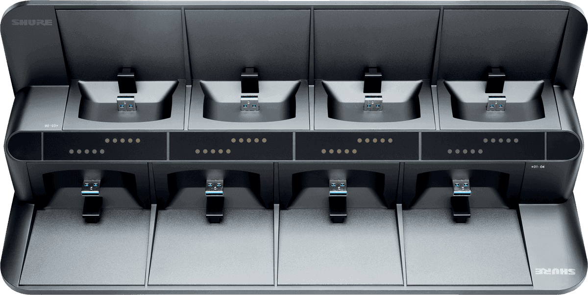 Le SHURE SBC850-E est un chargeur réseau capable de recharger simultanément huit émetteurs ULXD6 ou ULXD8 équipés d’accus SB900B. Une fois connecté au réseau, il permet de surveiller l’état de charge à distance et d’interagir avec les émetteurs via le logiciel Wireless Workbench.