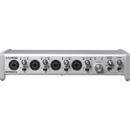 Series 208I Tascam est une interface Audio et MIDI 20 entrées - 8 sorties. L'interface audio/MIDI SERIES 208i est un choix approprié pour le studio professionnel et l'enregistrement live. Elle apporte jusqu'à 20 entrées et 2 sorties audio à votre ordinateur sous macOS ou Windows ou à votre appareil sous iOS, pour enregistrement et lecture jusqu'en 192 kHz/24 bits, avec la superbe qualité sonore propre à Tascam. Cette interface USB polyvalente se contrôle via le logiciel livré ; elle intègre un puissant mixeur DSP permettant d'appliquer réverbération numérique, compression, inversion de polarité et égalisation 4 bandes à chaque canal. Intégrer ce processeur à l'interface élimine tous les problèmes de latence, et soulage le processeur de votre ordinateur, ce qui lui permet de gérer plus efficacement les données audio.