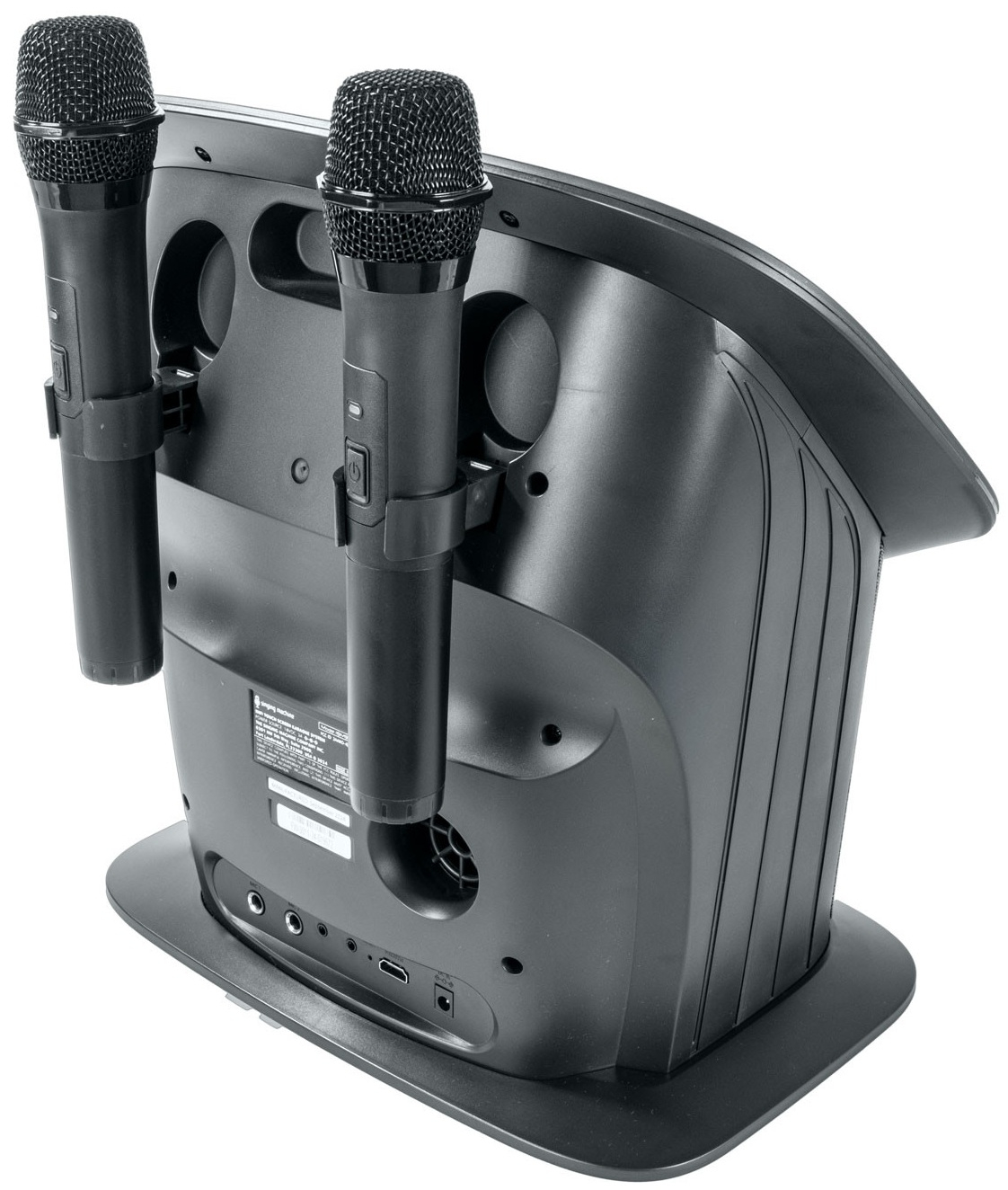 Le Karaoke Platinum - ISM9011 Singing Machine est livré avec deux microphones sans fil, ce qui permet de démarrer un duo immédiatement. En complément, l’appareil propose deux prises microphone en 6,3 mm, utiles si vous souhaitez ajouter des micros filaires ou varier les configurations selon les participants. Cette double approche favorise les performances à plusieurs, qu’il s’agisse d’un duo, d’un passage en relais ou d’un petit groupe, tout en gardant un pilotage centralisé via les commandes micro et effets.