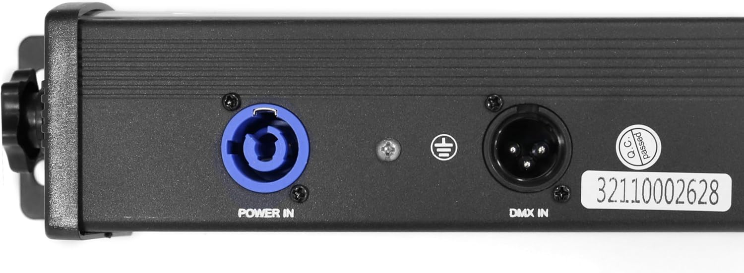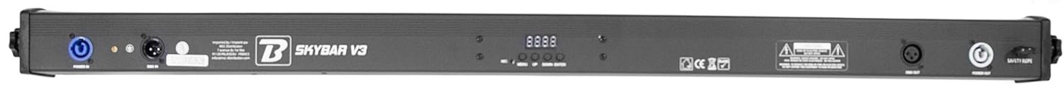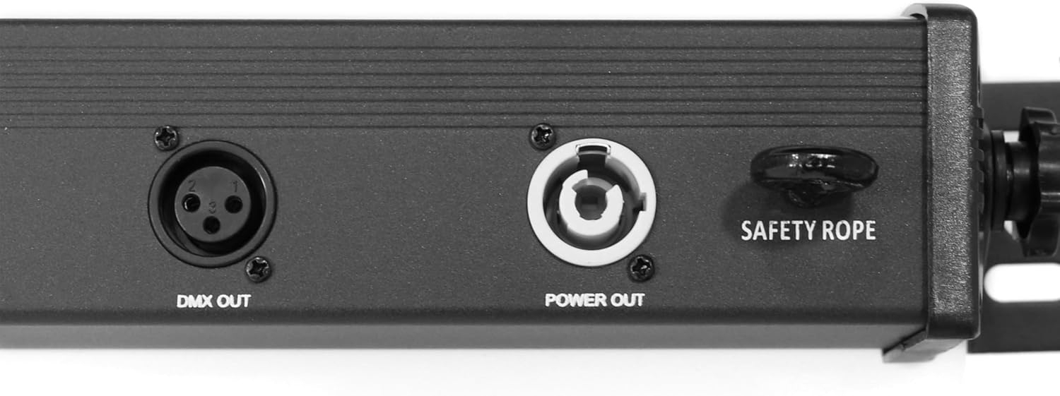 La BoomTone DJ Skybar v3 dispose de connectiques PowerCON IN/OUT pour un chaînage électrique sécurisé et rapide. Cela permet d’alimenter plusieurs barres en série sans risque de surcharge. Le chaînage DMX est également disponible pour relier les unités entre elles tout en conservant un contrôle global ou individuel selon le mode choisi (maître/esclave ou DMX).