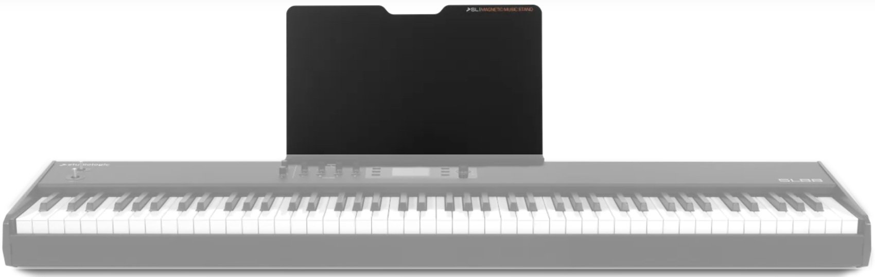 Ce pupitre magnétique Studiologic se distingue par son intégration directe aux claviers MK2. En pratique, la fixation sur rail est rapide et le maintien reste constant, même lors de jeux appuyés. Comparé à un pupitre universel indépendant, il réduit clairement l’encombrement et améliore l’ergonomie du poste de jeu.
