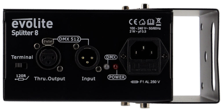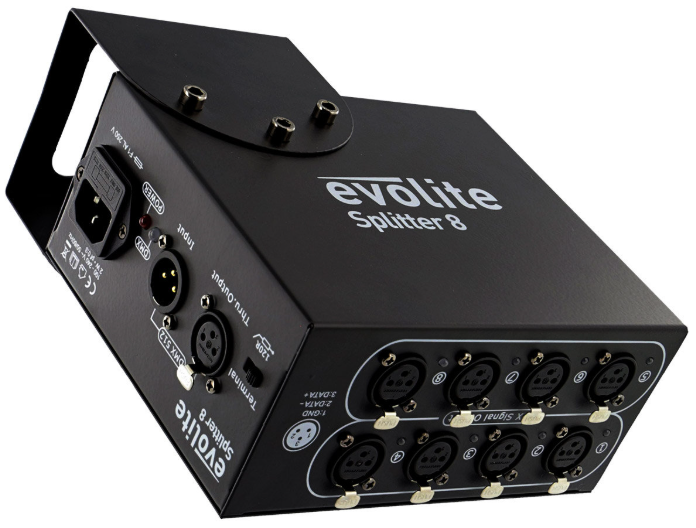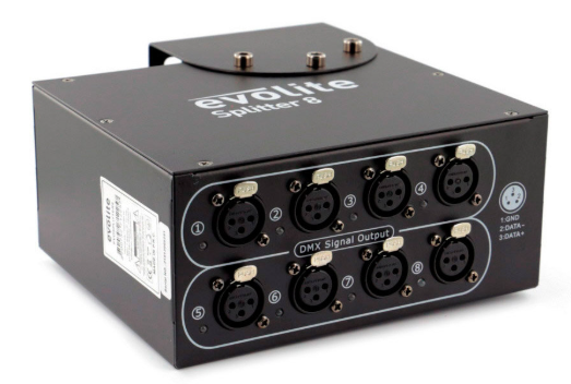 Le Evolite Splitter 8 permet de distribuer un signal DMX provenant d'une console vers 8 lignes indépendantes. Il garantit une transmission fiable sans perte de signal, même sur de longues distances, grâce à son amplificateur intégré et à l’isolation de chaque sortie.