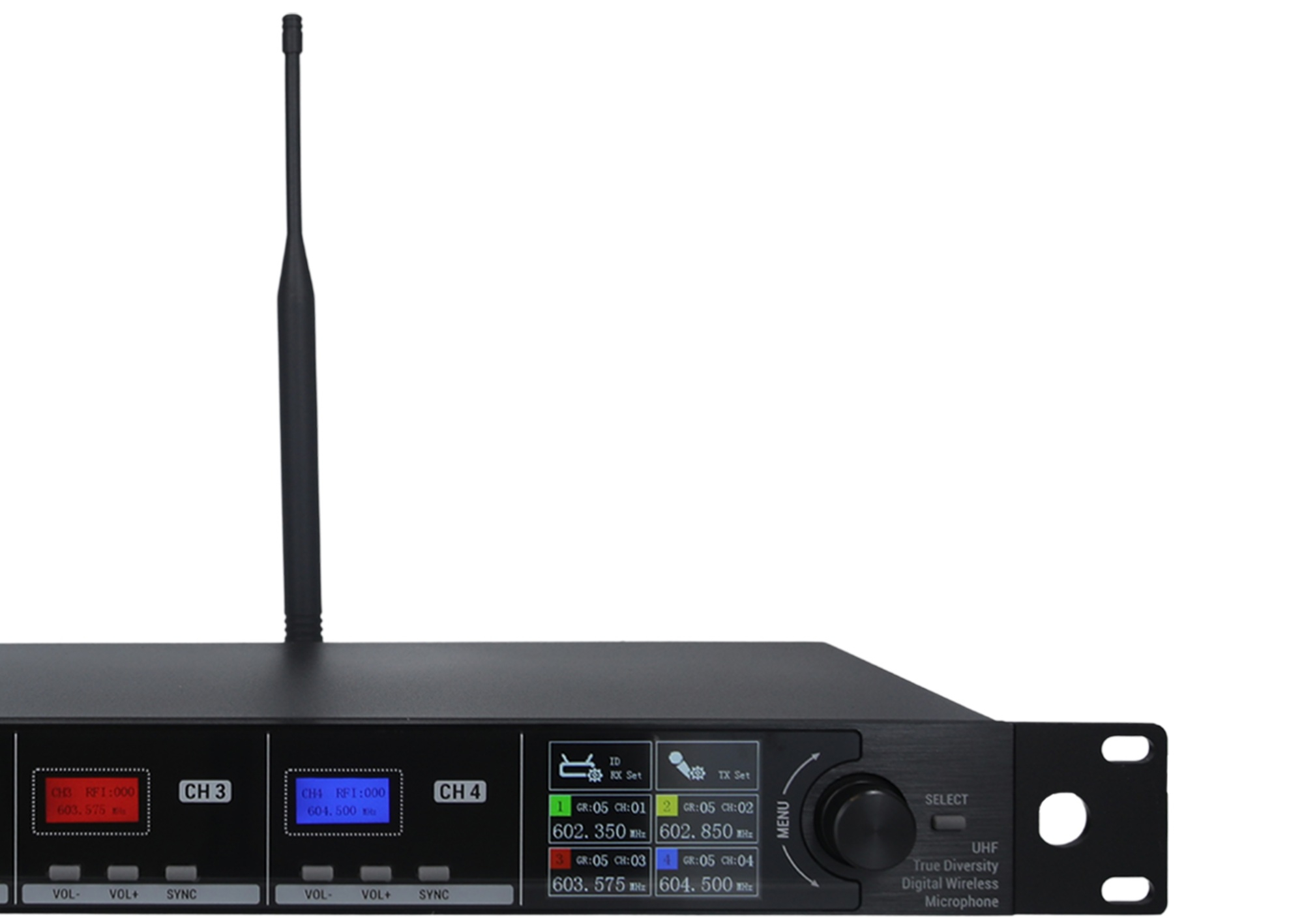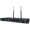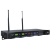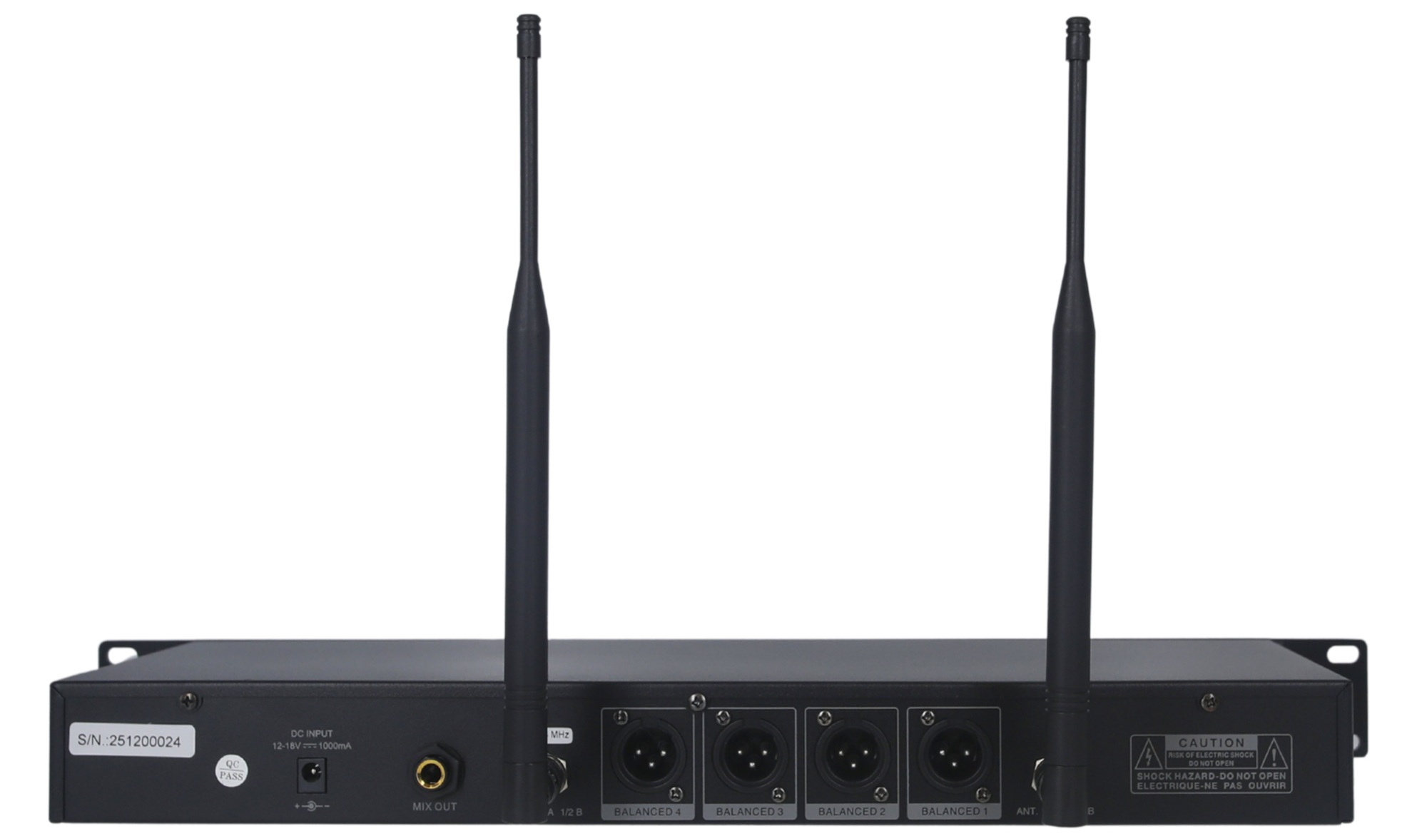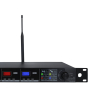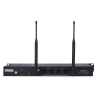 Sur l’aspect mécanique et connectique, le châssis est un 1U demi-rack avec pattes de rack fournies, ainsi que quatre socles pour antennes et quatre antennes séparées. Les dimensions du récepteur sont données pour 483 mm de largeur, 46 mm de hauteur et 162 mm de profondeur, pour un poids de 4,10 kg. Les émetteurs de poche disposent d’un écran LCD couleur, d’un gain réglable, et acceptent micro cravate et serre-tête à capsule cardioïde.