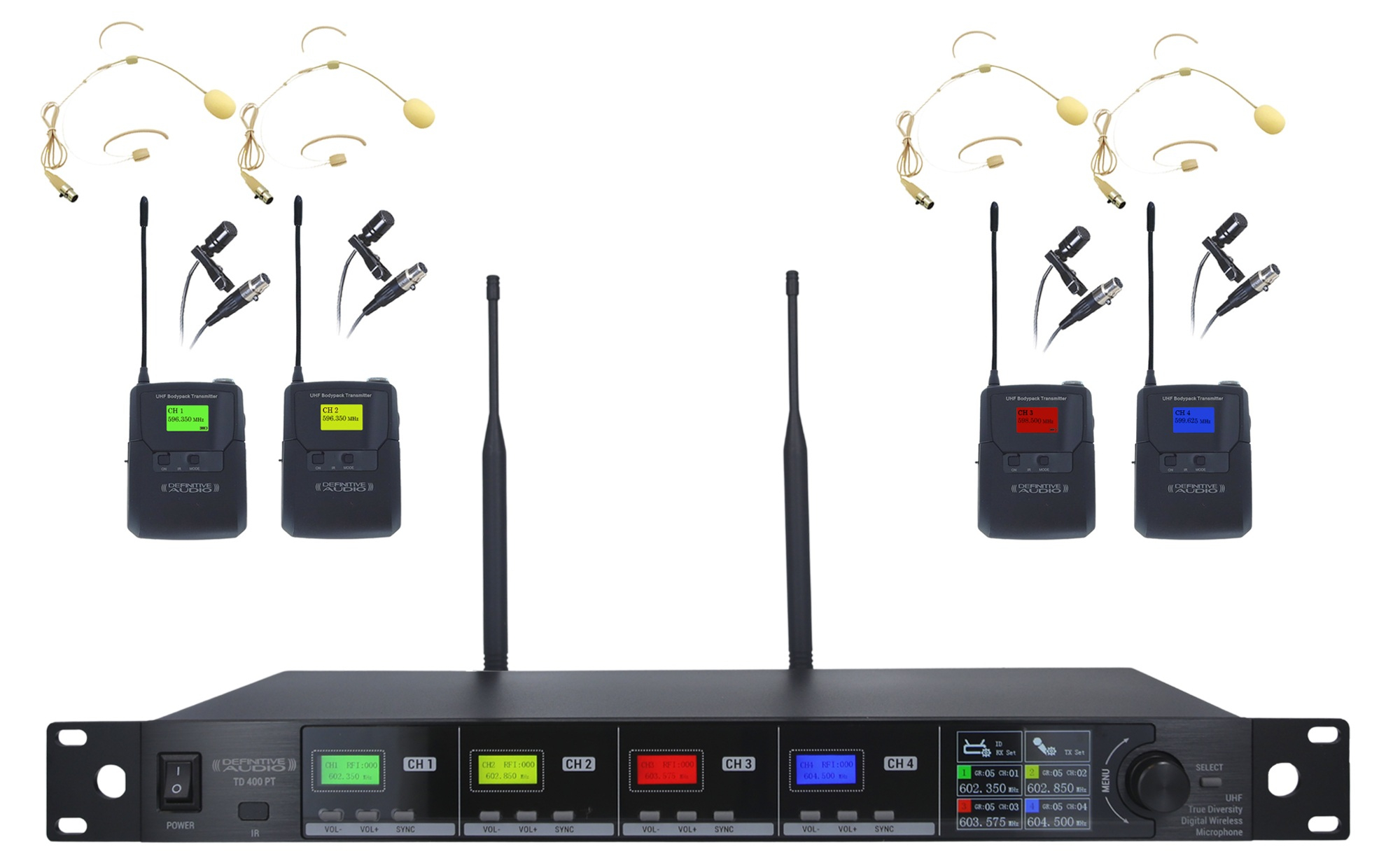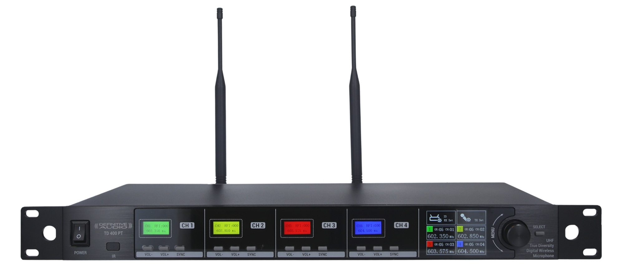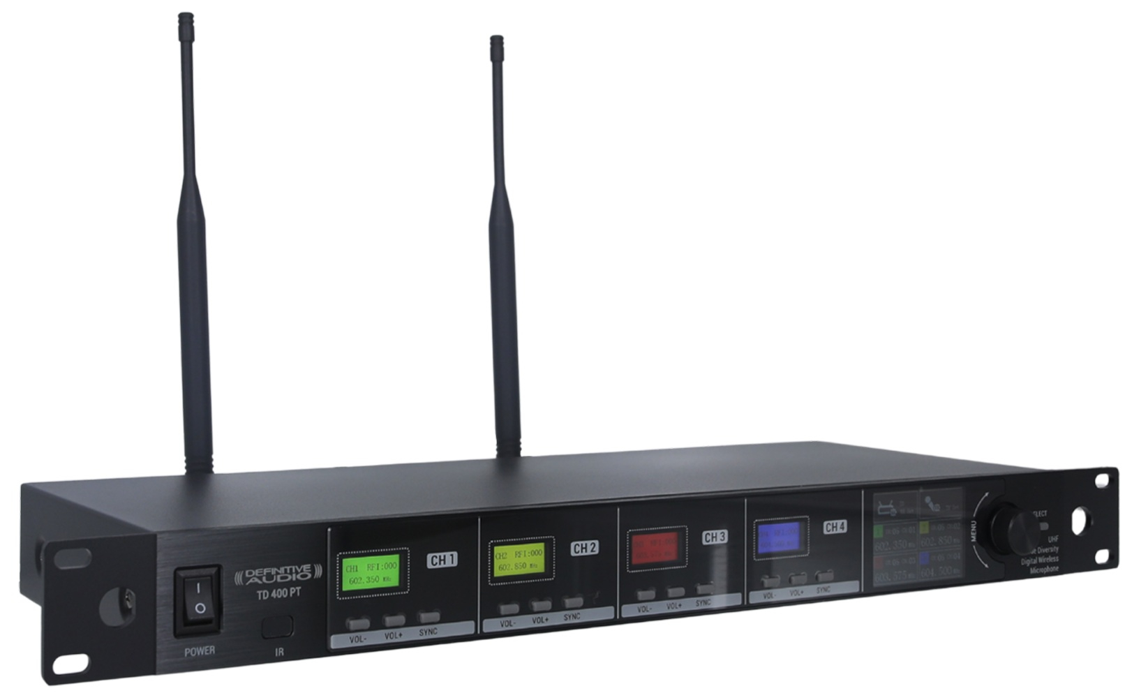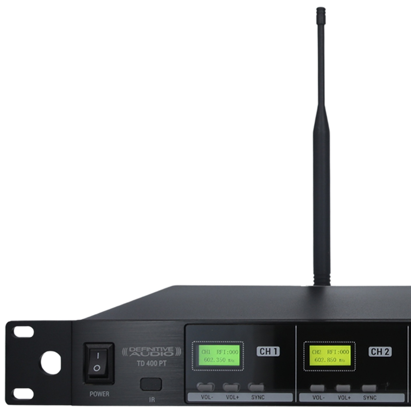 Le Definitive Audio TD 400 PT est un quadruple micro serre-tête UHF true diversity série. Conçu pour des prestations voix, scène, conférence et animation, ce système sans fil intègre 4 émetteurs de poche et un récepteur en châssis 1U avec 4 écrans LCD couleur et commandes dédiées. La technologie UHF en PLL apporte une sélection de fréquences stable sur 580–608 MHz, avec synchronisation ACT par infrarouge pour associer rapidement émetteurs et récepteur. Livré avec 4 micros serre-têtes et 4 micros-cravates, il s’adapte aux besoins de mobilité et de discrétion. La distribution d’antennes intégrée, les 4 antennes séparées et les sorties audio symétriques XLR et mix out jack facilitent l’intégration sur console et rack, avec un son clair, net et précis.