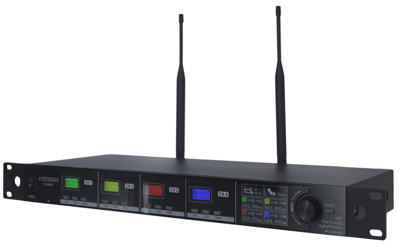 Le TD 400 PT a été pensé pour gérer quatre prises de parole sans multiplier les systèmes. En pratique, cela aide à organiser une table ronde, une animation ou une scène avec plusieurs intervenants, tout en gardant une installation lisible. La présence de quatre écrans LCD couleur et de boutons de contrôle dédiés favorise une gestion rapide des réglages, même lorsque l’on doit adapter le niveau ou le canal en cours d’événement.
