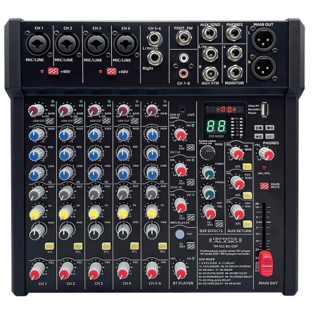 La console TM 433 BU DSP de Definive Audio redéfinit la qualité sonore. Avec 10 canaux polyvalents, des préamplis micros de pointe et une résolution 24bit/48KHz, elle offre une clarté sonore remarquable. Les 99 effets DSP enrichissent la créativité musicale.