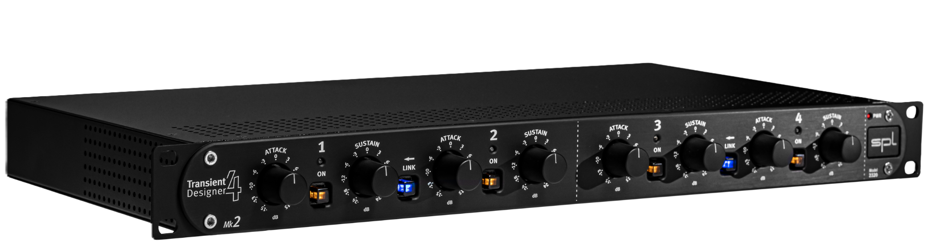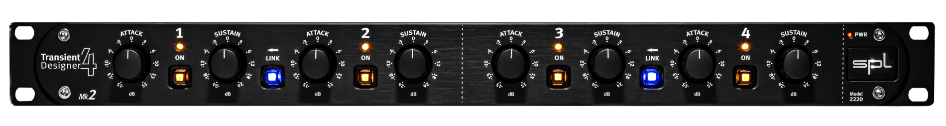 Le Transient Designer 4 Mk2 permet de coupler les canaux 1 & 2 ainsi que 3 & 4 pour un traitement stéréo cohérent. En mode stéréo, les réglages appliqués au canal gauche (canal maître) sont reproduits sur le canal droit, garantissant un traitement identique sur les deux canaux pour éviter les déséquilibres sonores.