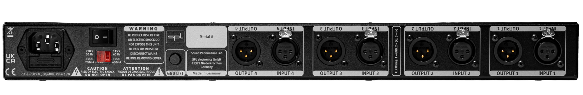 Chaque canal du SPL Transient Designer 4 Mk2 dispose d’une entrée et d’une sortie XLR symétriques avec contacts dorés Neutrik, assurant une transmission audio sans perte. Le niveau nominal est fixé à +6 dB pour une intégration parfaite dans un environnement de studio professionnel.