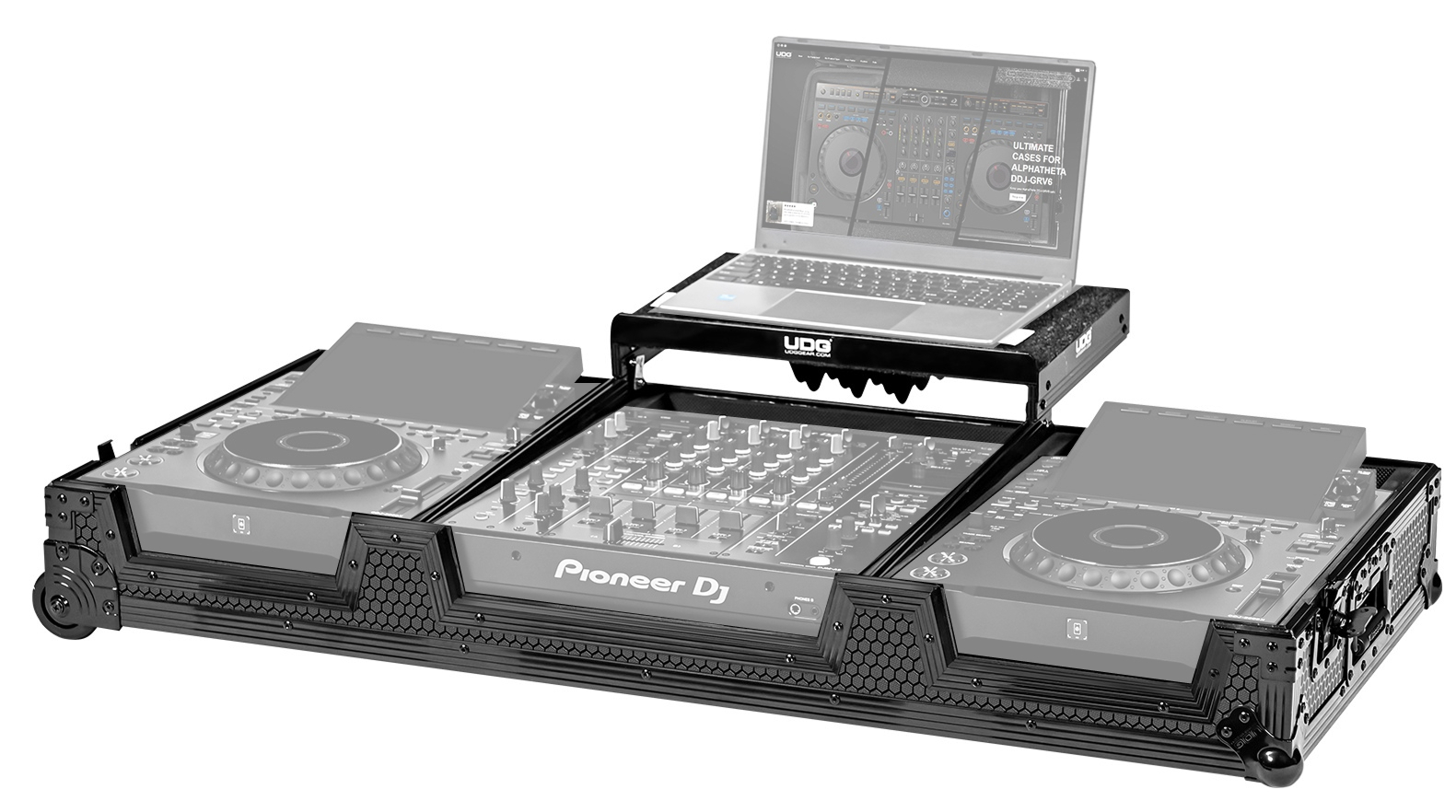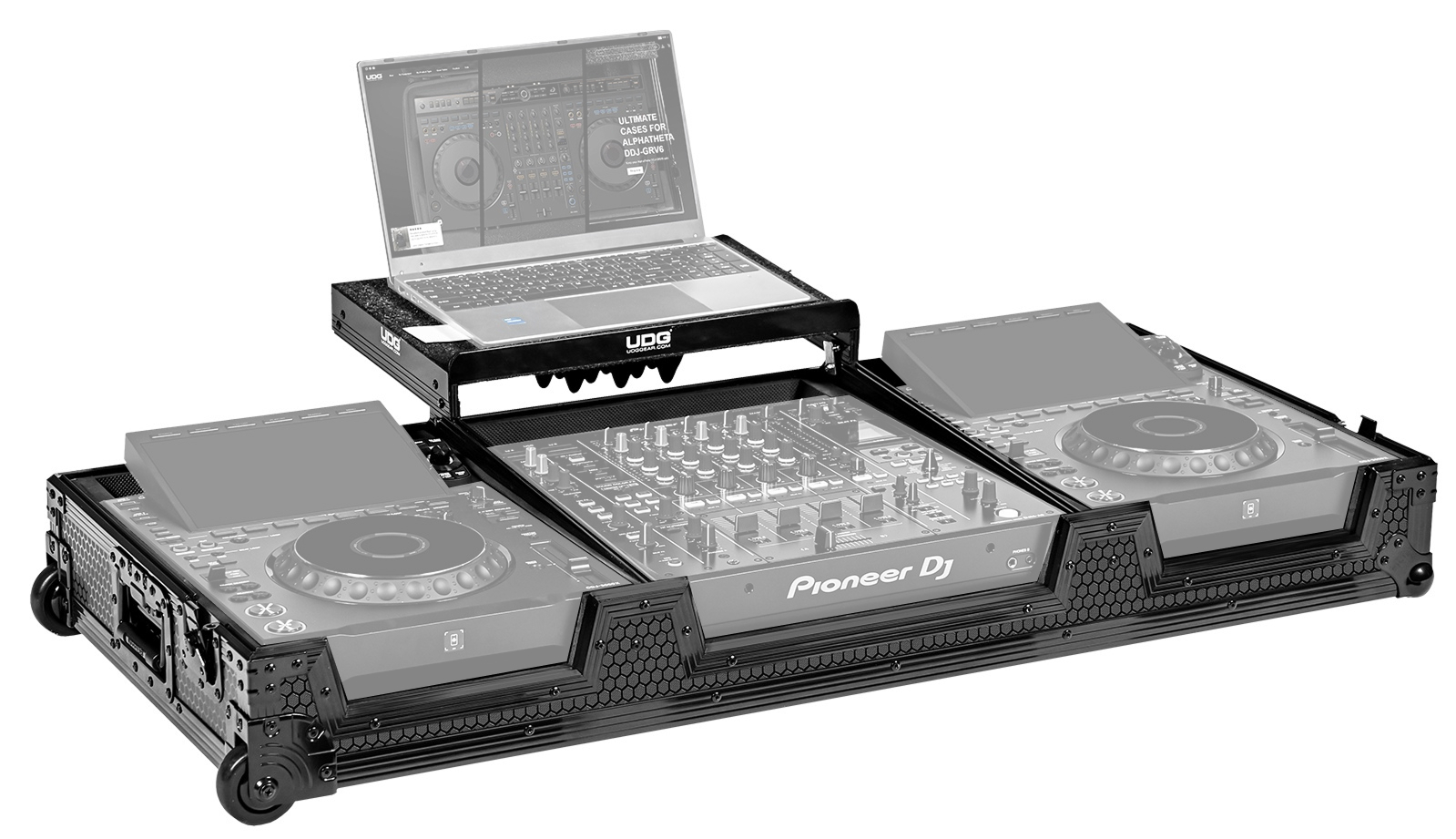 L’intérieur du Ultimate Flight Case UDG est équipé d’un rembourrage en moquette associé à une mousse EVA gaufrée au diamant. Cette combinaison assure un maintien précis des équipements et limite les vibrations durant le transport. Des mousses d’ajustement sont fournies pour garantir une insertion adaptée aux dimensions spécifiques du Pioneer DJ DJM-A9 et des AlphaTheta CDJ-3000X.