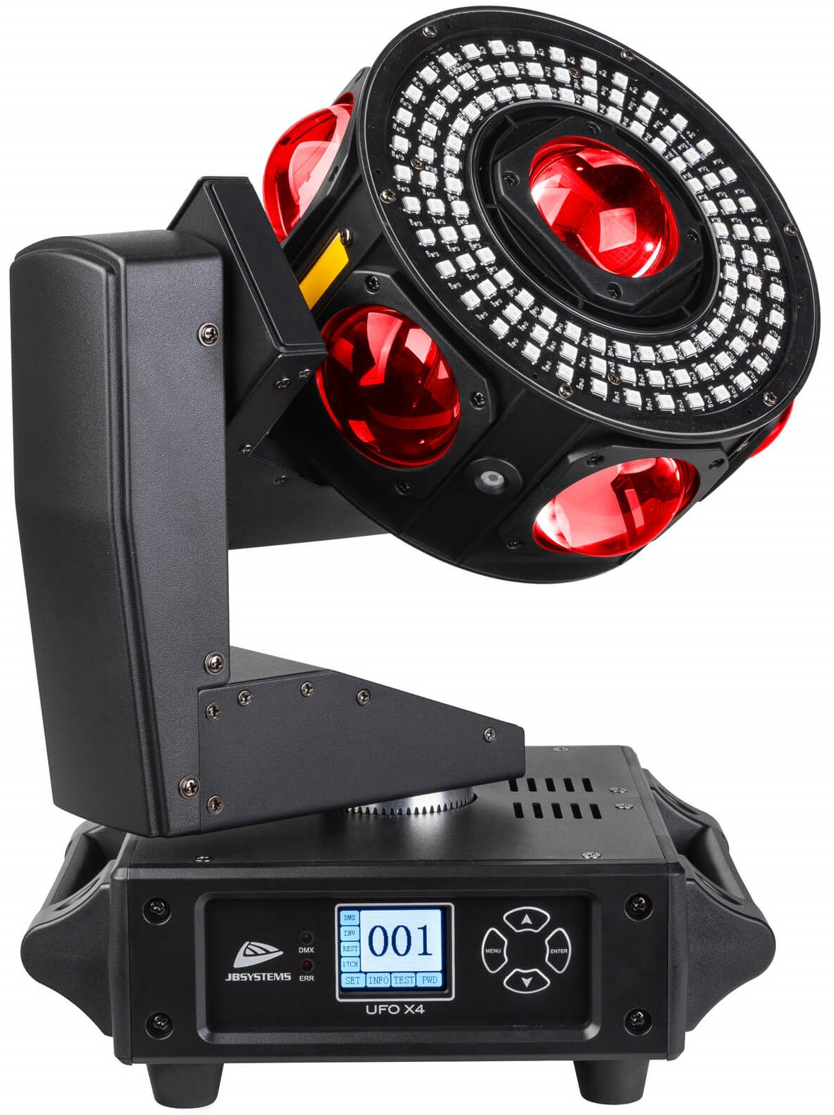 Le JB Systems UFO X4 est un jeu de lumière LEDs polyvalent conçu pour les DJ, bars et événements. Il combine 4 effets lumineux spectaculaires dans une seule unité : 28 LED RVBB de 3W, 108 LED RGB 5050, 3 stroboscopes de 10W et un triple laser RGB de 50mW. Sa tête rotative à 360° crée un effet immersif impressionnant. Grâce à ses multiples modes (DMX, autonome, maître/esclave), son écran LCD et sa compatibilité PowerCon®, il s’adapte à toutes les configurations scéniques. Compact et puissant, l’UFO X4 offre des shows lumineux dynamiques et faciles à contrôler.