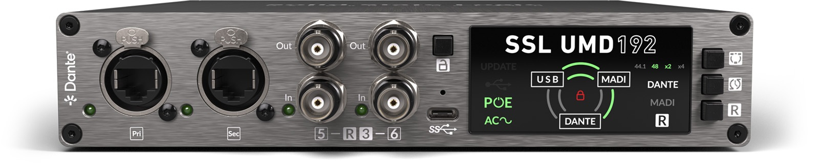 L’interface audio UMD192 de Solid State Logic offre une interconnexion fluide entre les formats numériques MADI, Dante et USB 3.0, assurant un transfert de signal rapide et fiable dans des environnements de production exigeants. Cette compatibilité multi-format facilite l’intégration au sein de réseaux audio complexes, qu’il s’agisse de broadcast, live ou studio.