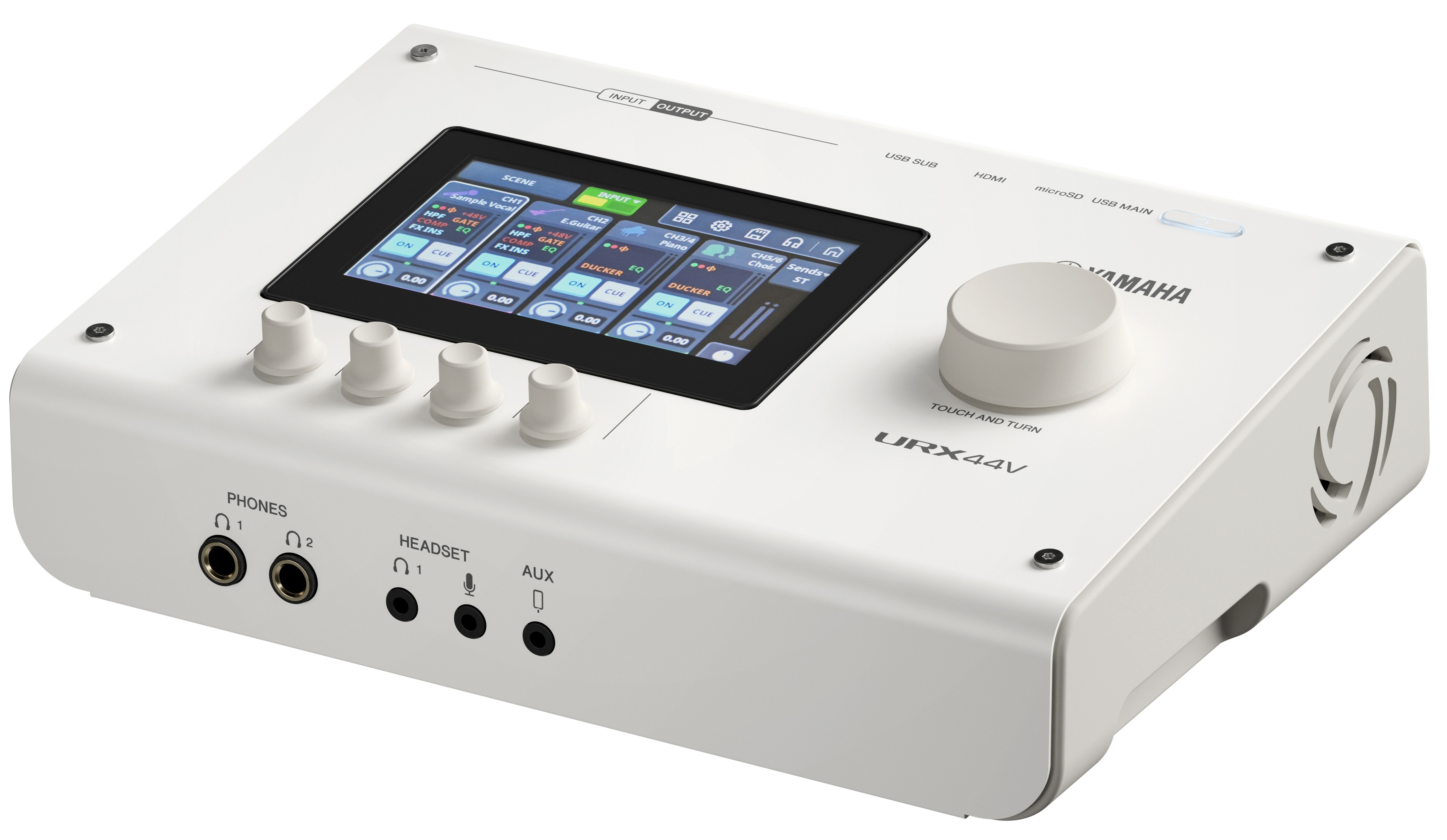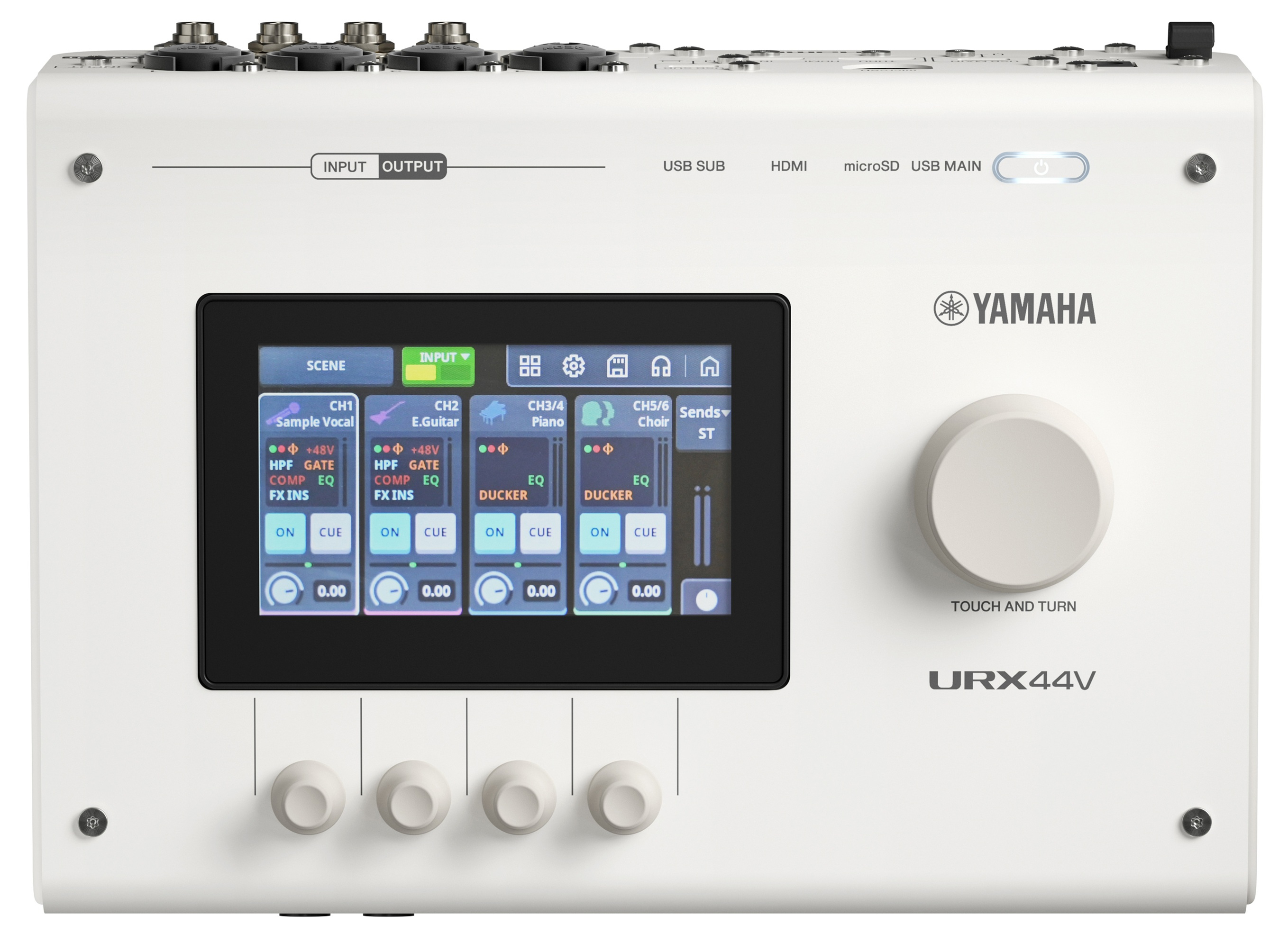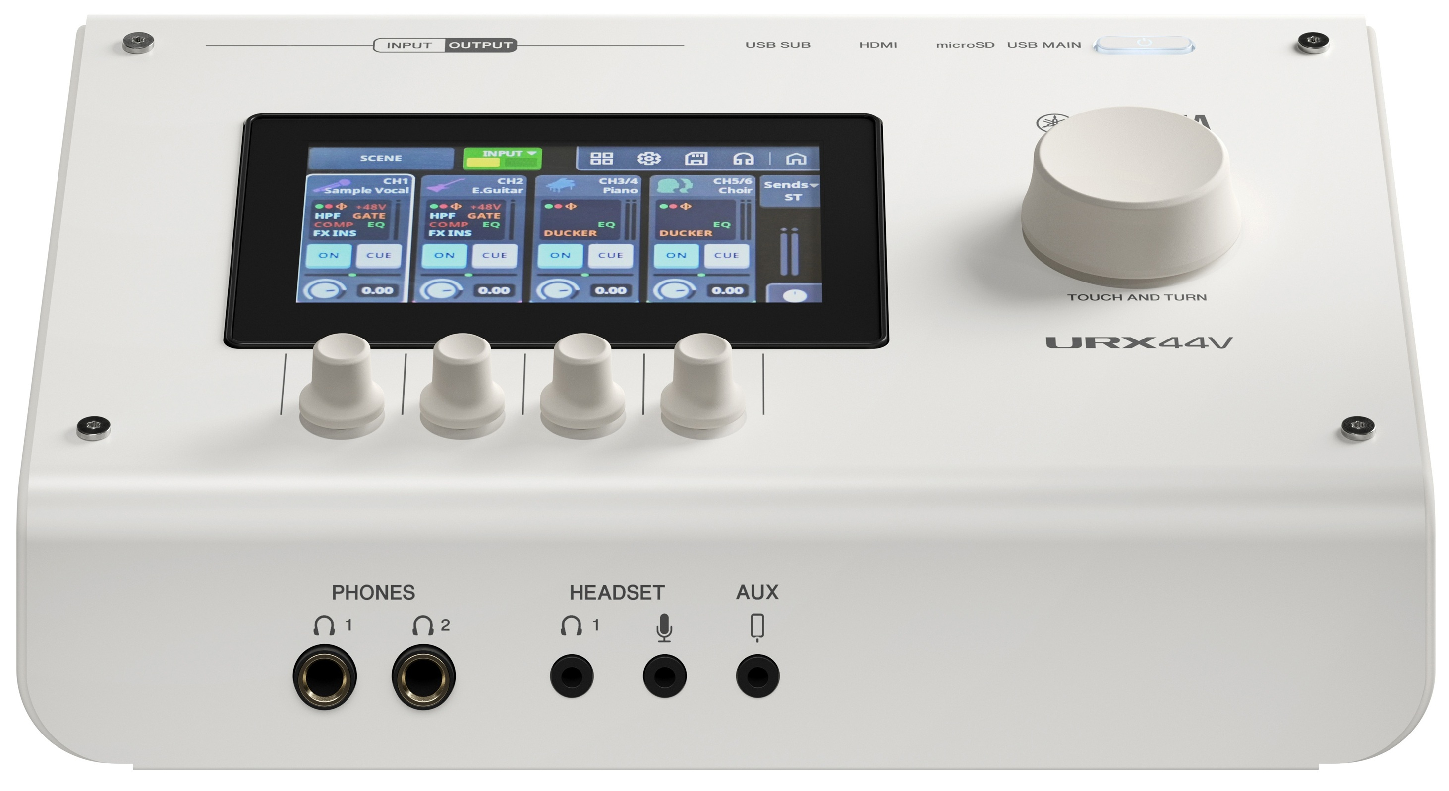 La Yamaha URX44V W embarque un compresseur, un gate, un égaliseur, une reverb, un simulateur d’ampli et un voice changer. Ils sont accessibles via l’écran tactile ou le logiciel fourni.