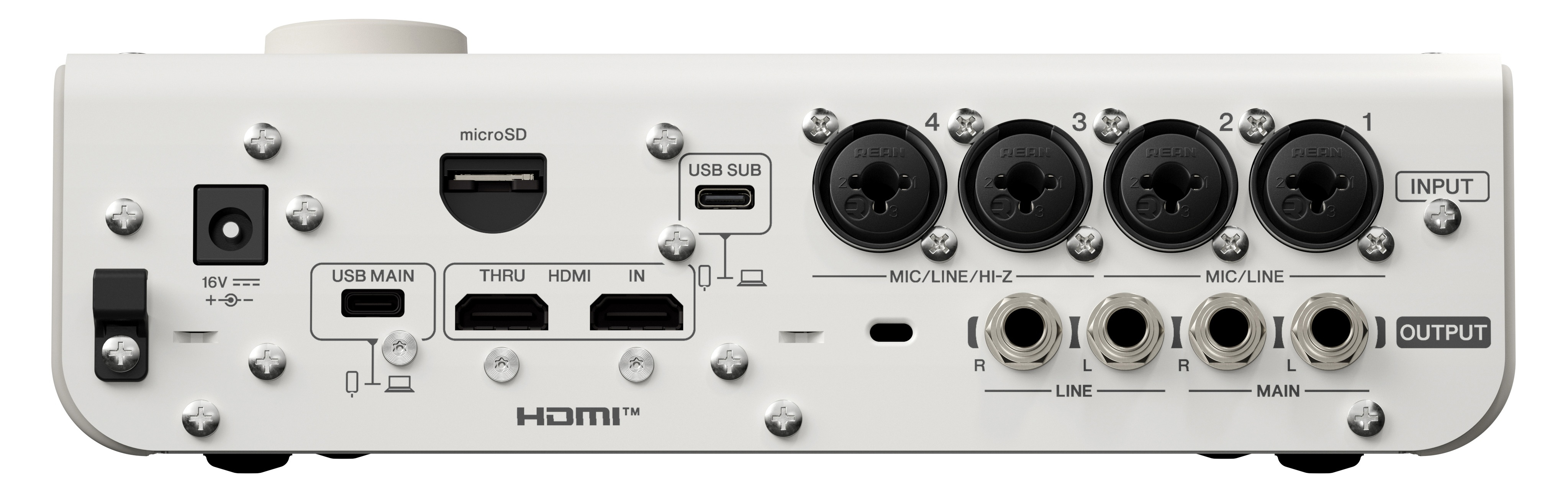 La Yamaha URX44V W propose 4 entrées Combo XLR/jack, une entrée mini-jack stéréo et une interface HDMI. Ce panel d’entrées/sorties offre une compatibilité étendue avec microphones, instruments, caméras et sources audio externes. La connectique est pensée pour une installation rapide en home-studio, sur scène ou en régie vidéo.