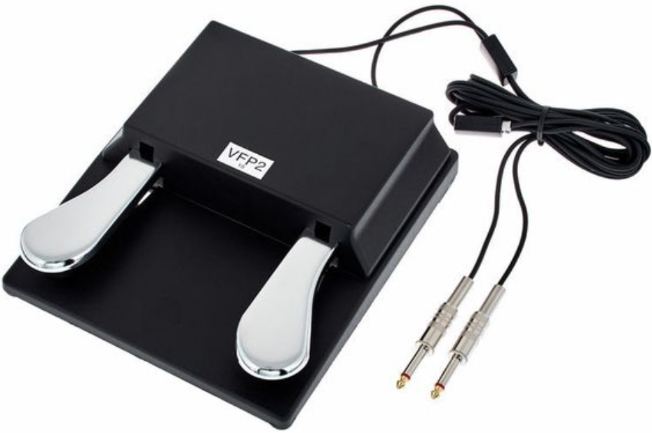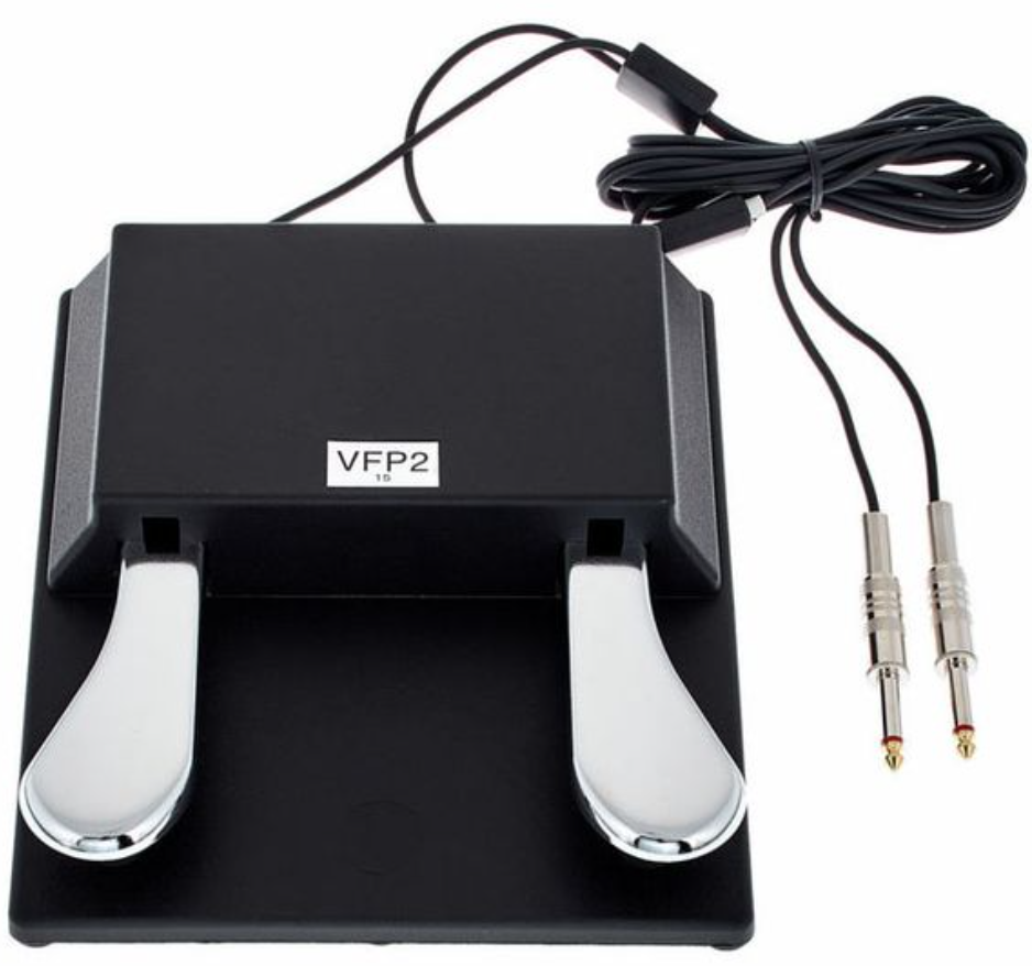 Le VFP2/15 combine une pédale de sustain principale et une pédale switch dans un même boîtier. Chaque fonction dispose de sa propre sortie jack 6,3 mm, permettant un contrôle distinct selon les capacités du clavier ou du piano numérique compatible.