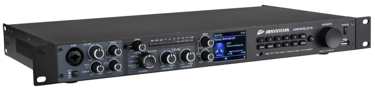 Le JB Systems WEBAMP PRE est un préamplificateur audio rack 19″/1U qui centralise la radio Internet, le DAB+, la FM, Spotify Connect, le Bluetooth et la lecture USB jusqu’à 128 Go. Pensé pour la distribution du signal, il s’intègre dans une installation existante en laissant l’amplification à des amplificateurs de puissance. Ses deux sorties principales symétriques permettent de gérer deux zones avec volume et tonalité indépendants, pratique en commerce multi-zones, accueil ou résidentiel. Quatre entrées accueillent des sources externes comme TV, PC ou lecteur CD. L’entrée microphone avec talk-over automatique facilite les annonces en baissant la musique. L’écran couleur 2,4″, la télécommande infrarouge et les applications UNDOK / OKTIV simplifient le contrôle, en WiFi ou Ethernet RJ45.