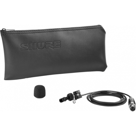 Le Shure WL185MTQG est livré avec une bonnette anti-vent clipsable qui réduit les bruits de vent et autres interférences sonores, une pince d'accroche pour une fixation sécurisée, et une housse de transport à fermeture éclair pour protéger le micro lors de déplacements. Ces accessoires ajoutent à la praticité et à la durabilité du produit.