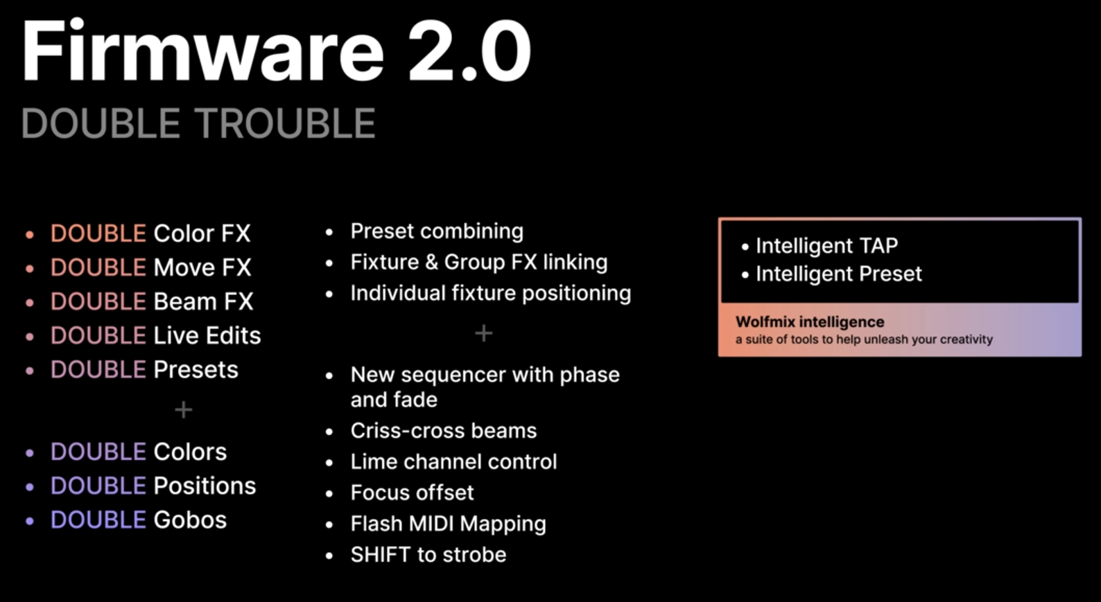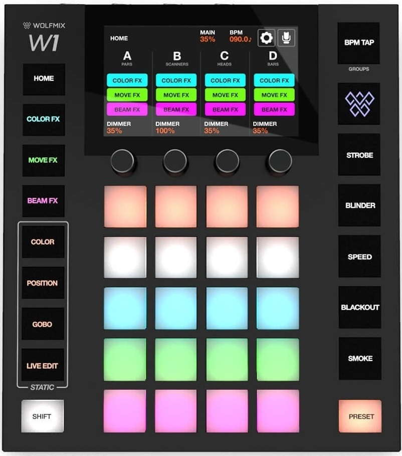 Le Wolfmix W1 MK3 est conçu pour répondre aux exigences des performances live modernes. En tant que contrôleur DMX autonome, il permet de créer, modifier et déclencher des scènes lumineuses sans dépendre d’un ordinateur. Cette approche assure une grande stabilité en situation de concert, de club ou d’événementiel, tout en réduisant les risques liés aux configurations informatiques complexes.
