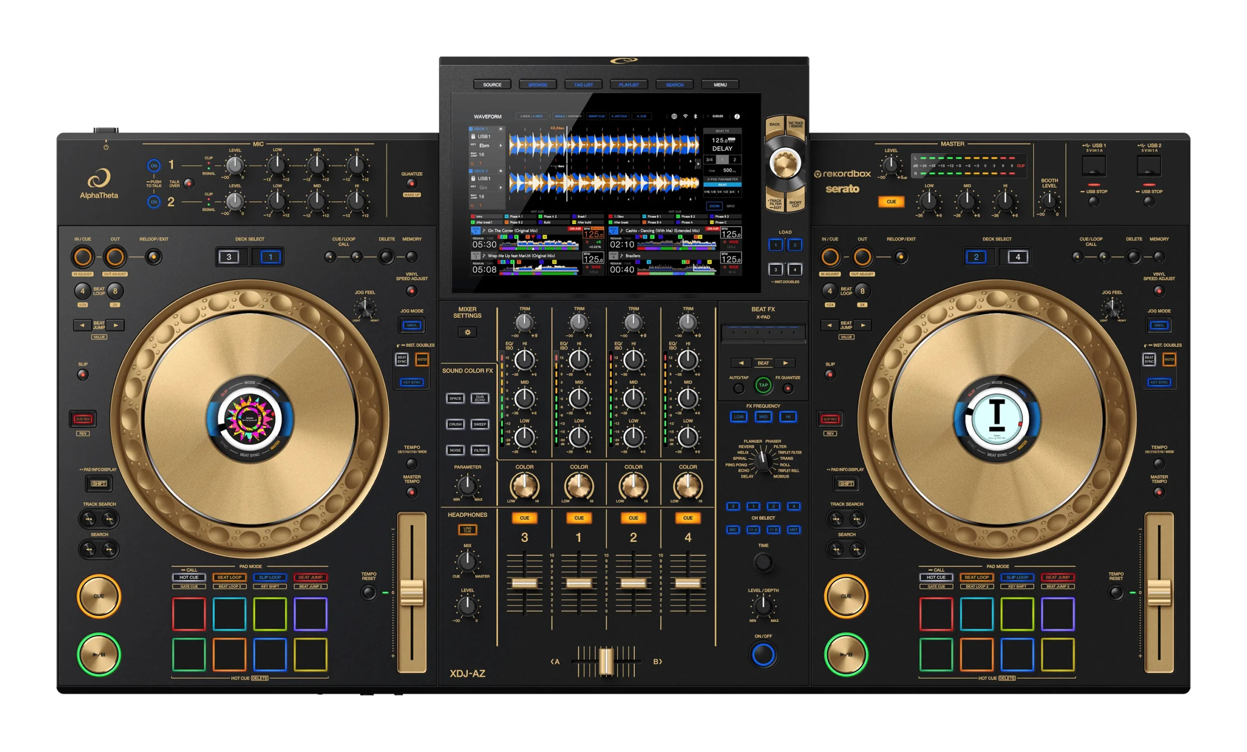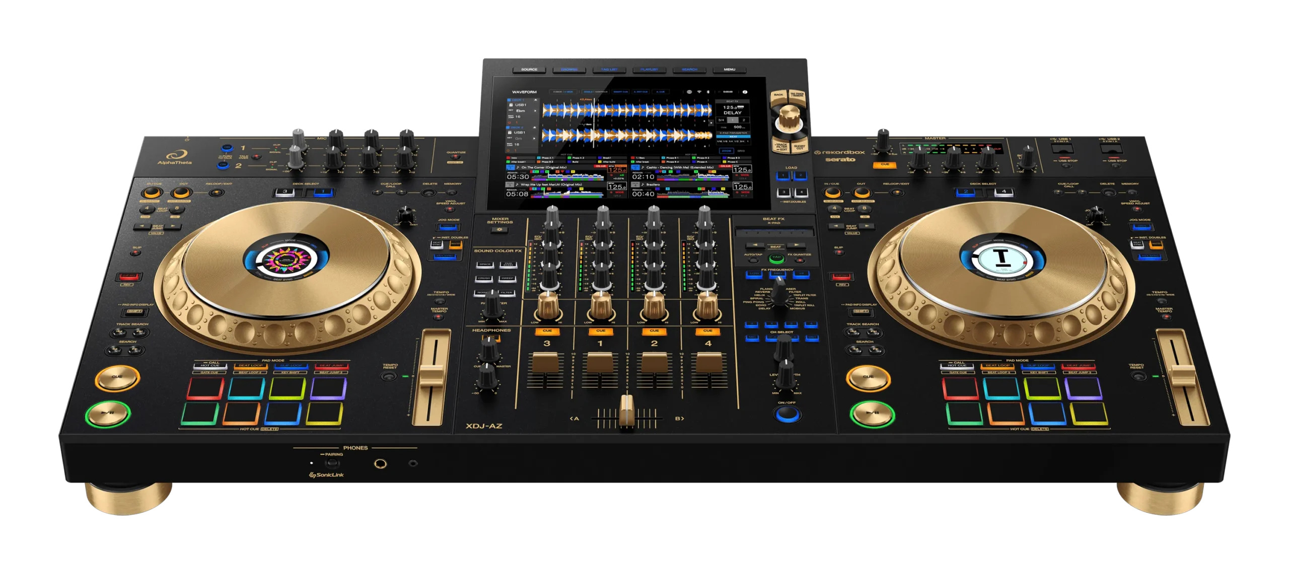 Le AlphaTheta XDJ-AZ-N est un contrôleur DJ tout-en-un professionnel 4 voies au format club, en édition ultra-limitée coloris gold. Il combine un design inspiré des modèles CDJ-3000 et DJM-A9 avec un large écran tactile 10,1” pour un contrôle fluide et une navigation rapide dans les morceaux. Grâce à la compatibilité StreamingDirectPlay, il offre un accès direct à Apple Music et Beatport. Ses jogs de 206 mm, ses effets professionnels et sa lecture autonome sur 4 platines assurent des performances dynamiques. Connectivité avancée : Wi-Fi, USB-C, rekordbox, Serato DJ Pro et SonicLink pour un monitoring sans fil à latence ultra-faible. Parfait pour les DJs exigeants recherchant un système DJ puissant, flexible et transportable, taillé pour la scène et le club.