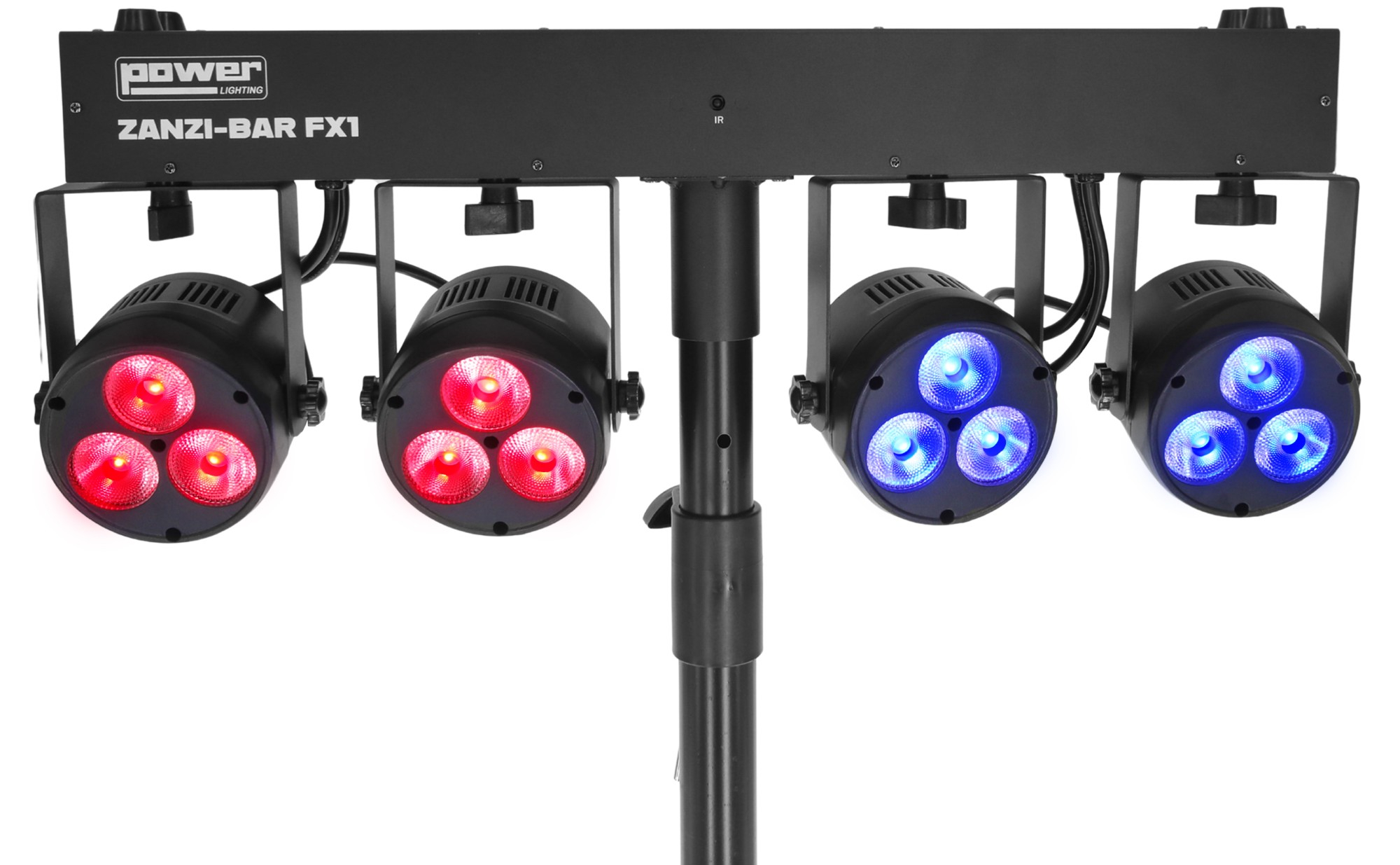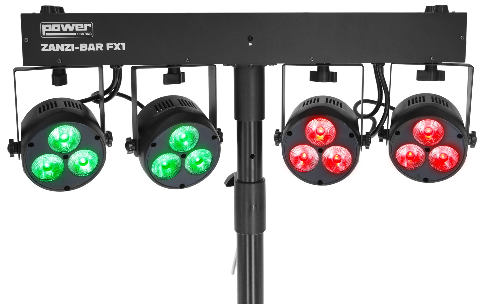 Le système ZANZI-BAR FX1 de Power Lighting est doté de LEDs RGBW Quad 4-en-1 de 3x8W par projecteur, réparties sur quatre modules Par Slim. Cette technologie permet une reproduction lumineuse vive, sans séparation de couleurs, idéale pour les effets dynamiques en concert, soirée ou installation scénique mobile.