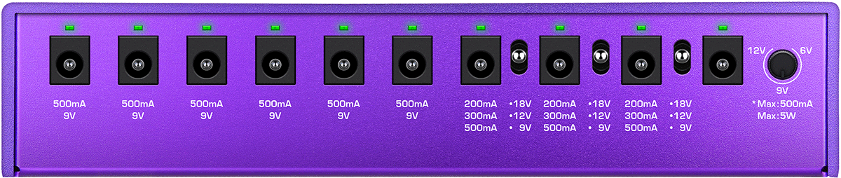 Le NUX ZEUS propose dix sorties isolées, dont six fixes à 9 V / 500 mA, trois réglables à 9/12/18 V et une variable de 6 à 12 V. Cette flexibilité permet d’adapter l’alimentation aux besoins spécifiques de chaque pédale, y compris les fuzz ou effets vintage sensibles au voltage.