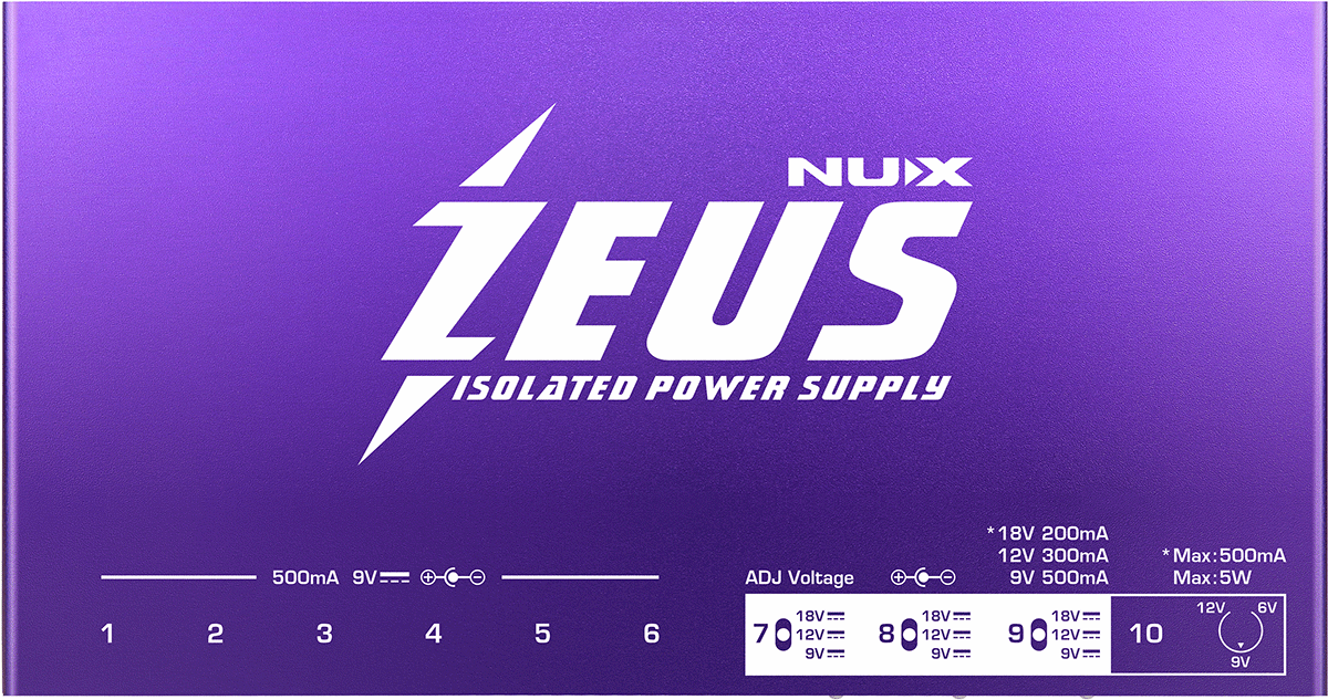 Le NUX ZEUS est un boîtier d’alimentation multiple pour pédales d’effet guitare et basse. Il offre 10 sorties isolées en courant continu, dont 6 fixes à 9 V / 500 mA, 3 réglables (9 V/12 V/18 V) et 1 variable de 6 V à 12 V, ainsi qu’un port USB 5 V / 1,5 A. Sa conception compacte et légère, associée à une double isolation et des alimentations à découpage performantes, garantit un fonctionnement stable et silencieux. Le NUX ZEUS est conçu pour les pedalboards exigeants, compatibles analogiques et numériques. Il assure une alimentation propre, sans bruit parasite, avec des protections contre la surchauffe et les surintensités. Fourni avec 13 câbles, il s’adapte à toutes les configurations et fonctionne partout dans le monde (100–240 V).