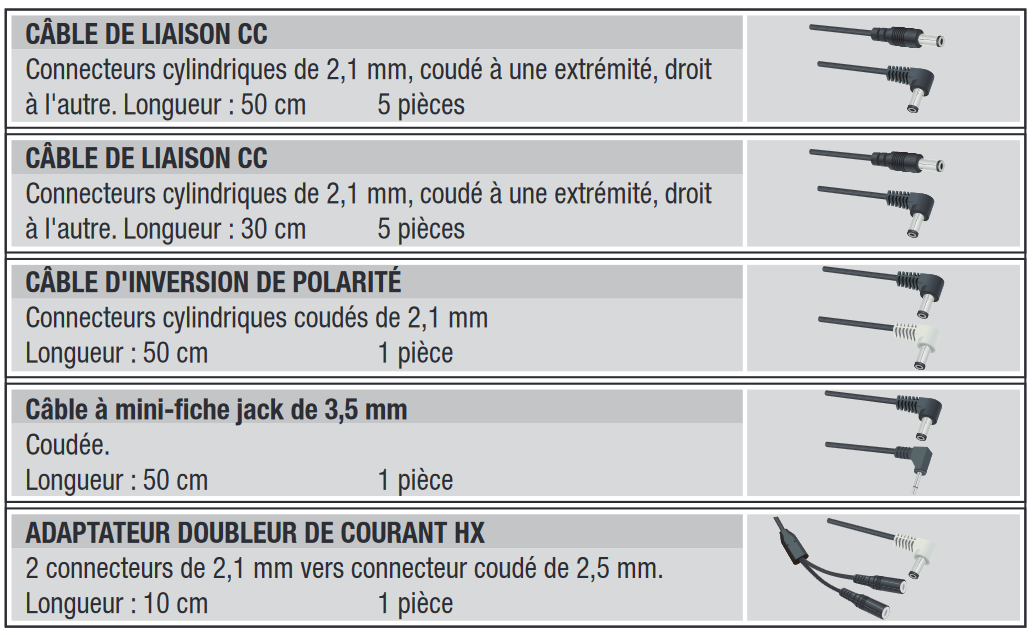 Le boîtier est livré avec 13 câbles d’alimentation de longueurs et embouts variés : câbles coudés, droits, inverseurs de polarité ou doubleurs de courant. Cette diversité permet de s’adapter à toutes les pédales d’effet ou multi-effets du marché.