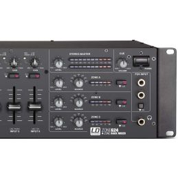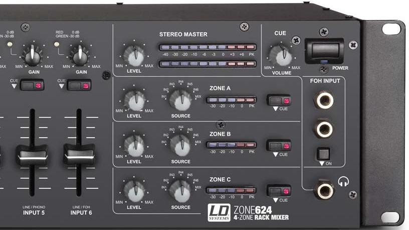 Les deux entrées microphone sont symétriques : elles sont équipées d'un égaliseur 3 bandes, d'une alimentation fantôme 12 Volts et d'une fonction Talkover (activable individuellement sur chaque sortie zone via des sélecteurs sur le panneau arrière). Les 6 voies d'entrée stéréo du mixeur ZONE 624 sont équipées chacune d'un potentiomètre de gain, de LED de présence de signal et d'écrêtage, d'un fader de 45 mm, d'une touche Cue et de connecteurs RCA/cinch. L'entrée 6 possède en outre des entrées symétriques sur jack. Le mixeur propose aussi une entrée AUX commutable, sur mini-jack 3,5 mm stéréo et un port USB, gérant un flux de signaux audio en entrée et en sortie stéréo (Recording Out), qui permet l'utilisation du ZONE 624 en tant qu'interface audio.